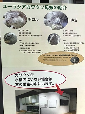 ここに飼われてるのはユーラシアカワウソの「チロル」と「ゆき」(アクアマリンふくしま生まれ)の母娘。そういえばゆきの姉妹の「はな」は井の頭自然文化園に来てるんだった。行かないと。