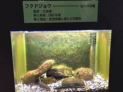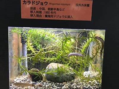 寝ちゃったので他の展示に。日本にいるドジョウ、と言ってもすでに結構外来種が混ざっているらしい。