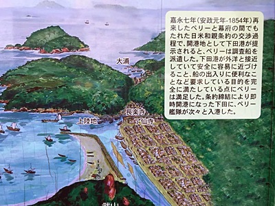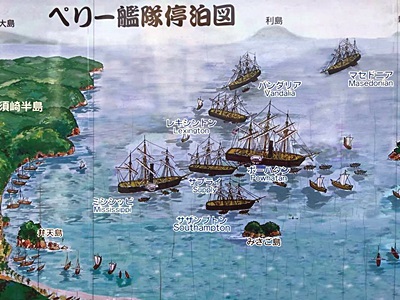 13時20分発のバスで早くも駅に戻る。駅の壁面にペリー艦隊の停泊場所再現地図が。