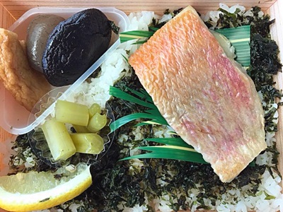 昼に買っておいた駅弁「金目鯛塩焼弁当」。「人気No.1」ということで残り1個だったのを無事ゲット。駅に戻ってきた13時半にはこれ含め全駅弁が売り切れ。買っておいてよかった。それ考えたら10分のバスに乗れなくてよかったのか。まあ駅弁なかったらその辺のレストランに入ればいいんだけど。