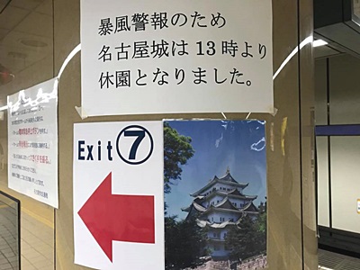 ホテルに荷物を置き、6月に完成した本丸御殿見るべく名古屋城に向かうが、最寄りの市役所駅にこの掲示。決断速いのはいいことだが、早すぎない?仕方がないのでホテルに戻る。