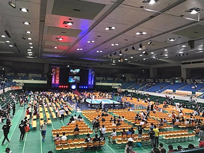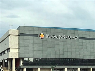 愛知県体育館到着。今「ドルフィンズアリーナ」っていうのか。バスケットチーム?雲が出てきて多少涼しくなったが雨風はまだ。