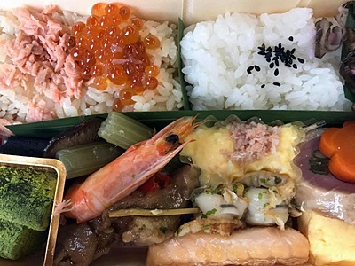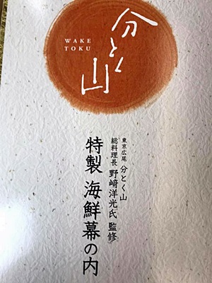 朝飯は新宿駅で買った「分とく山の海鮮幕の内」。
