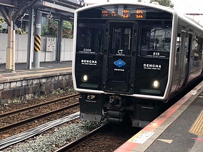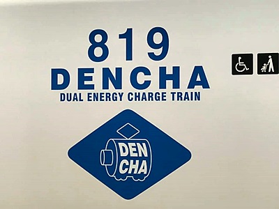 入線してきたのは蓄電池併用式電車「DENCHA」(Dual ENergy CHArge trainの略)だった。へー。初めて見た。調べたら2年前から走ってるらしい。