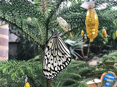 サナギの殻がクリスマスツリーのオーナメントになってるし。