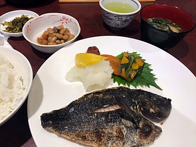 天神に移動して「味の正福」天神コア本店で黒鯛塩焼定食1580円。長蛇の列だったが、1人で並んでたら早く入れてもらった。