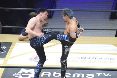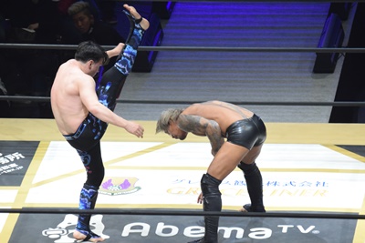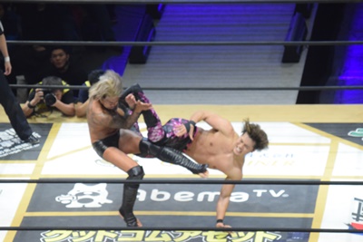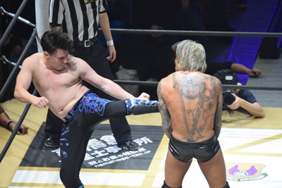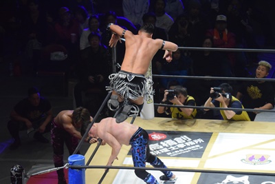 ムーンライトエクスプレスは#STRONGHEARTSにダブルのドロップキック(左写真)、場外に落とす。
