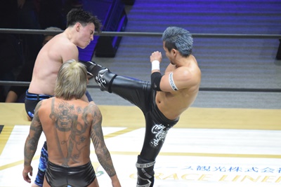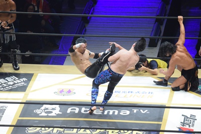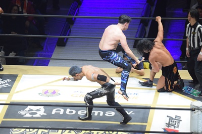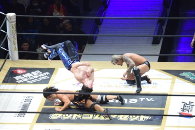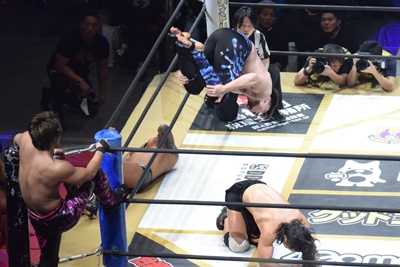 CIMA突進、MAOリープフロッグ、一回転して欽ちゃんジャンプかと思いきやCIMAは背後からMAOにドロップキック、吉岡入ってダブルのドロップキック(右写真)。