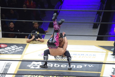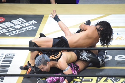 高梨も回転エビ固め、これもブロックして酒呑童子の2人が重なる(右写真)。