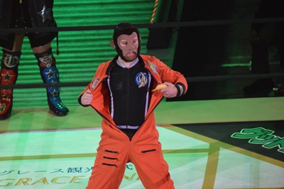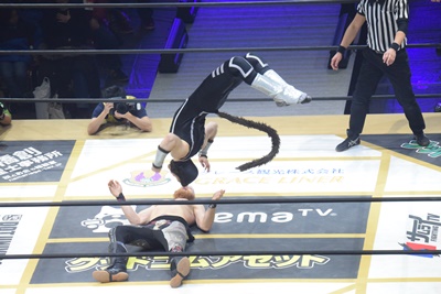ジェイソンのスワンダイヴをかわしてロープ反転ミサイルキック(左写真)、スペースモンキーにタッチ。