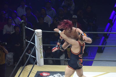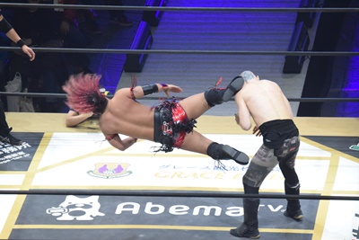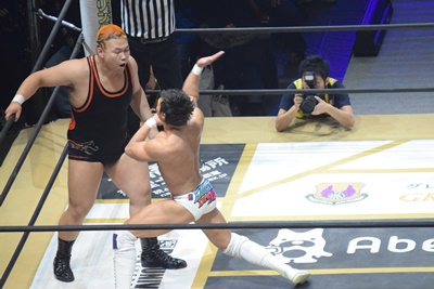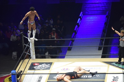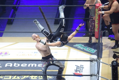 勝俣コーナーからダイビングクロスボディ(右写真)、