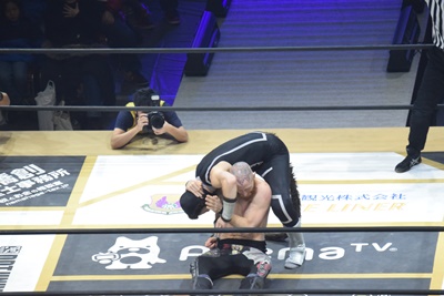 吉村ボディスラムに行こうとするが勝俣背後に回ってスリーパー(右写真)、