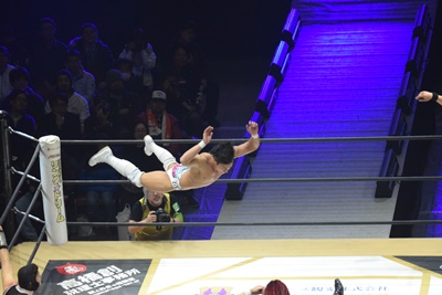 ジェイソンをリングに戻すとコーナーからトペ・コン・ヒーロ(右写真)。