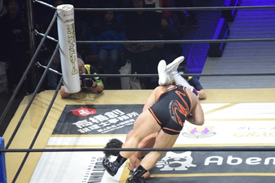 勝俣ジェイソンに延髄蹴り(右写真)、
