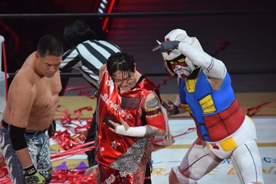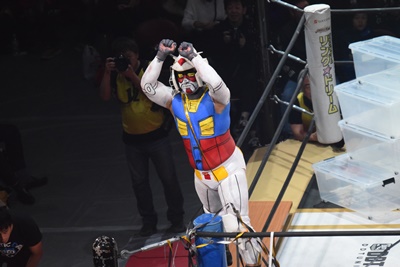 大社長がガンダムのボディペインティングで入場(右写真)。