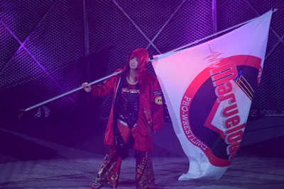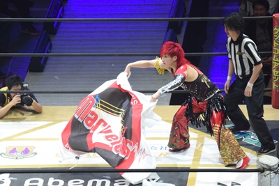 マーベラスのでっかい旗を担いで彩羽匠が登場(左写真)。