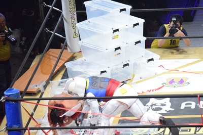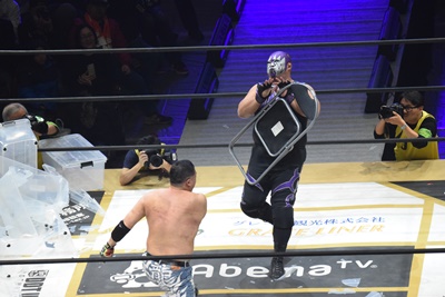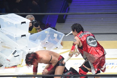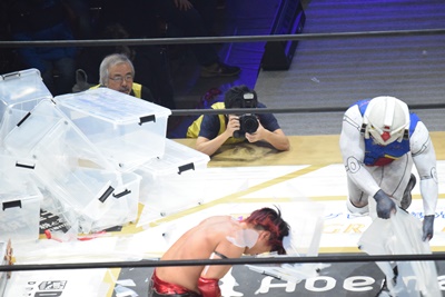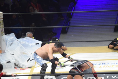 伊東がプラケース攻撃、高尾はヒジで破壊(左写真)、