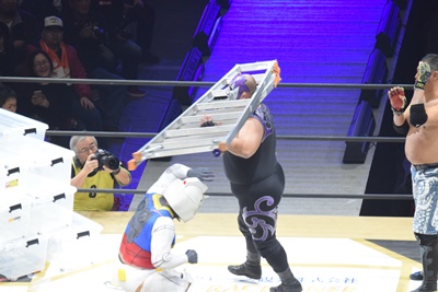 ポーリーがラダーを首にかけて回転(右写真)、高木を弾き飛ばす。
