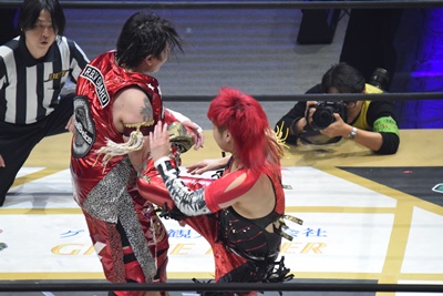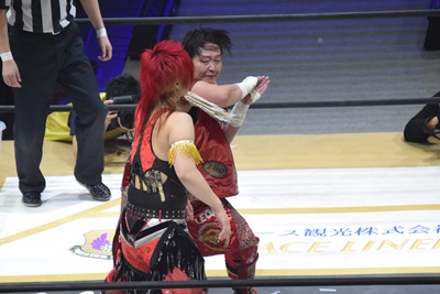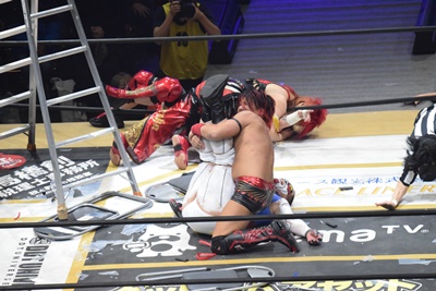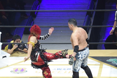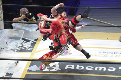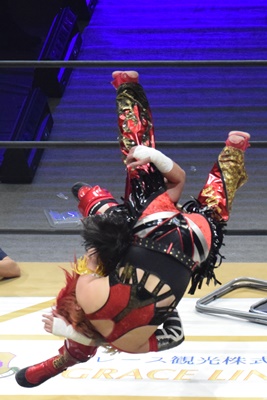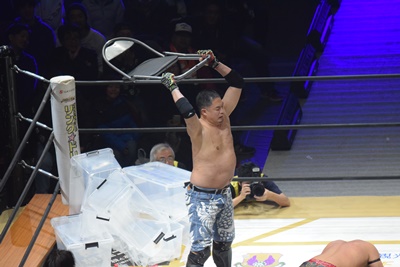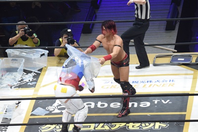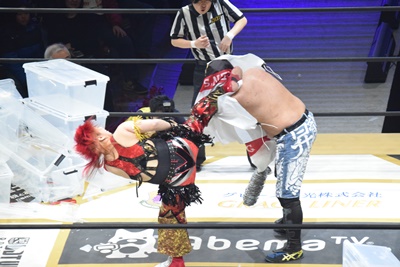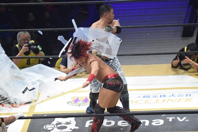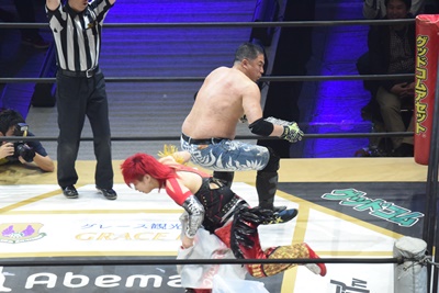 彩羽がイス攻撃、長与はエルボーでイスごと吹っ飛ばし(左写真)。イスを取り上げて背中に振り下ろす。
