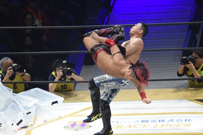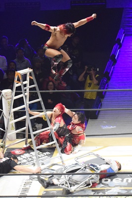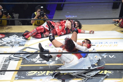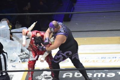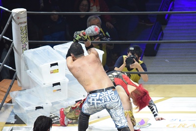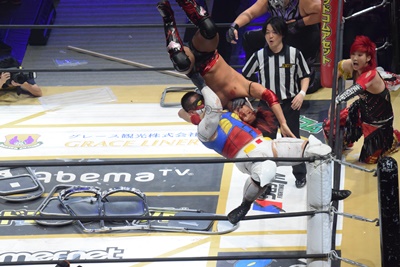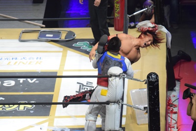 エプロンに落ちた高尾をぶっこ抜き雪崩式ブレーンバスターに(右写真)。