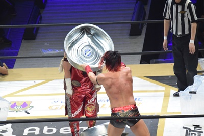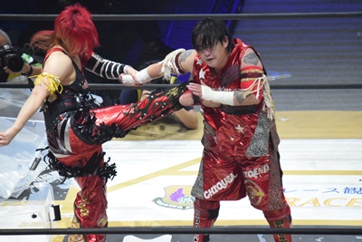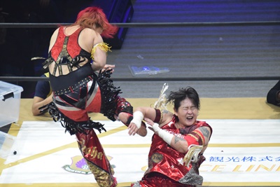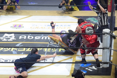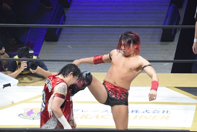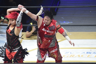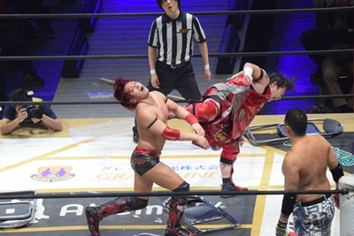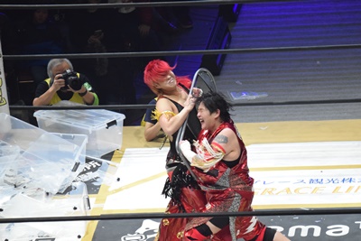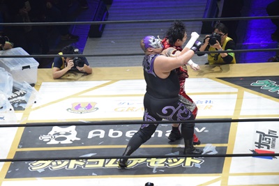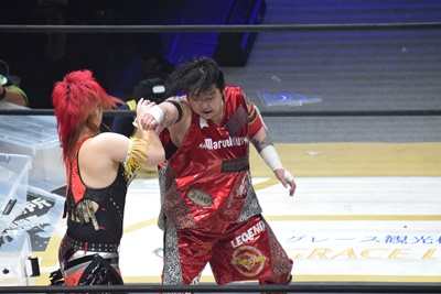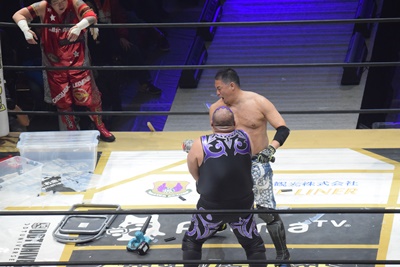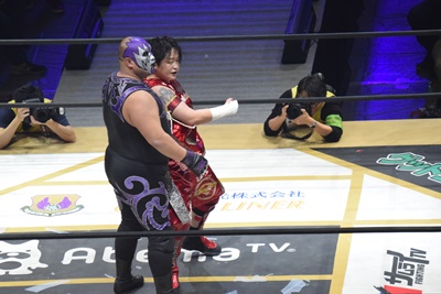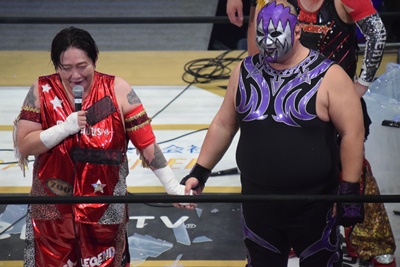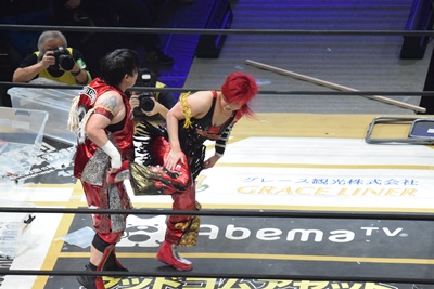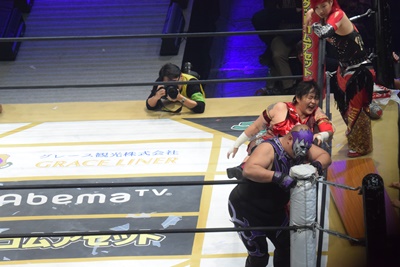 高尾蒼馬&マッド・ポーリー入場(左写真)。