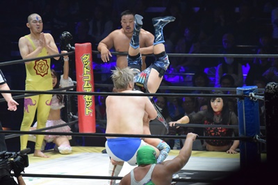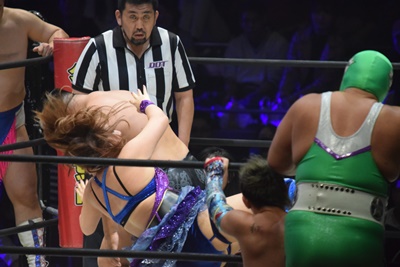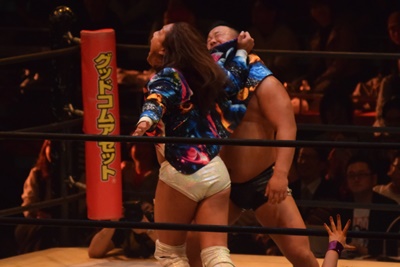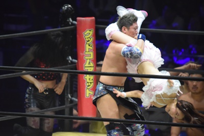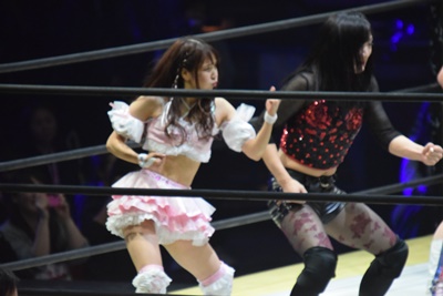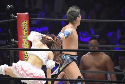瑞希ロープに振る、大石切り返す、瑞希コルバタ(左写真)、朱崇花にタッチ。大石もイケメンにタッチ。