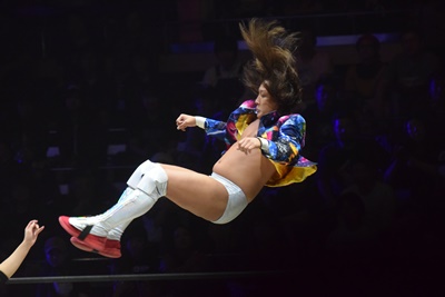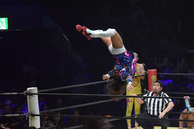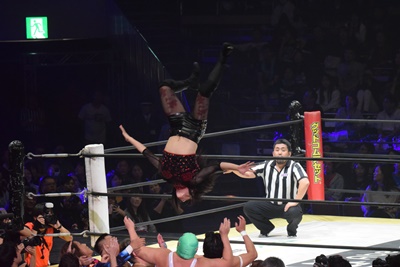 朱崇花はトップロープからのケブラーダ(右写真)。「消化試合」でこんなの見れない。