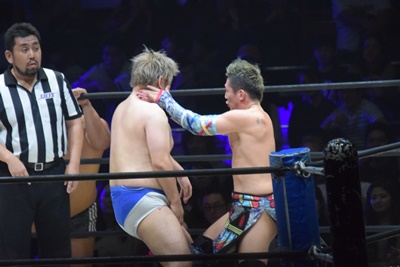 髪を引っ張る(左写真)。会場からは大ブーイング。