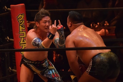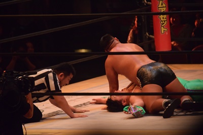 ショルダーブロックの打ち合い、飯野がまなせを倒す(右写真)、