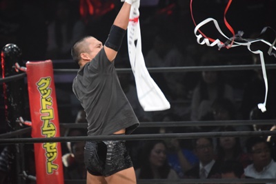 ならば、と阿部が起き上がったところに必殺のニールキック(左写真)、カウント3。