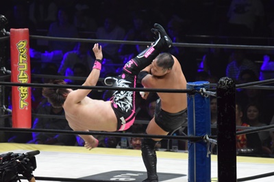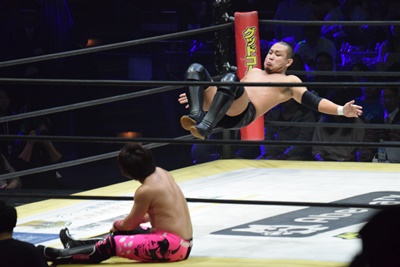 阿部コーナーの石井に突っ込む、石井かわしてバックを取ると投げっぱなしジャーマン、そしてオーバーヘッドキック(左写真)、