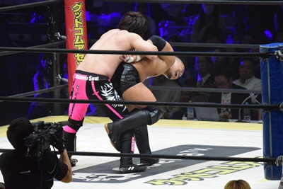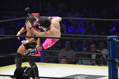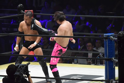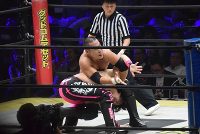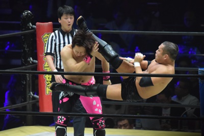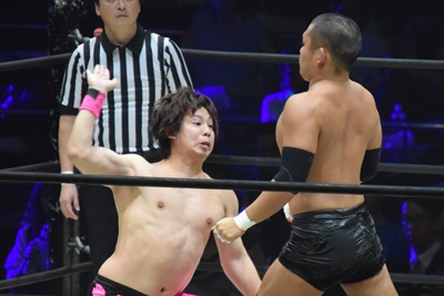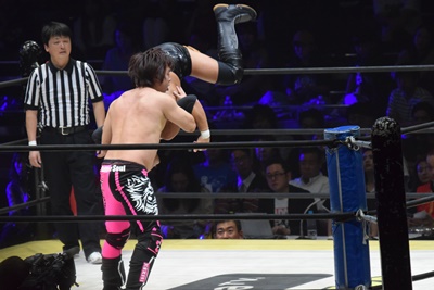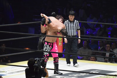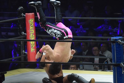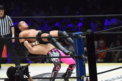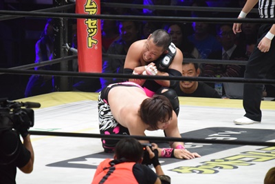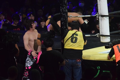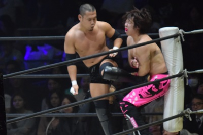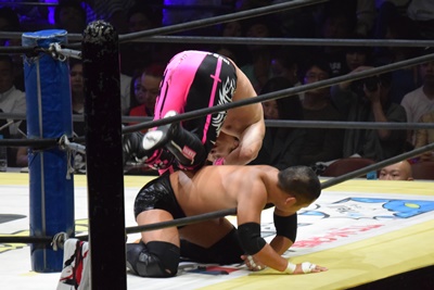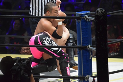 阿部伊良部パンチからお卍固め(左写真)、石井ロープ。5分経過。