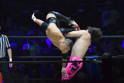石井高角度ダブルアームDDT狙う、阿部ブロック(右写真)、