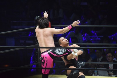 石井強引にコーナーへのタイガースープレックス(左写真)。