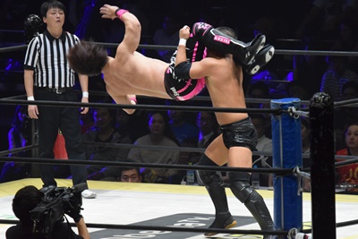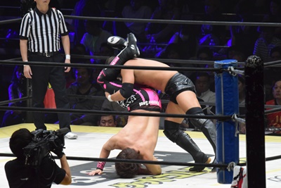 両腕極めドライバー(右写真)、しかしこれも阿部は2で返す。