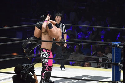タイガースープレックスの体勢、阿部こらえる(右写真)、