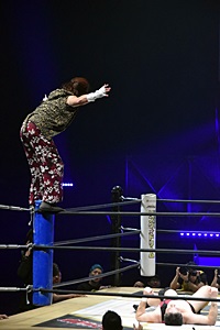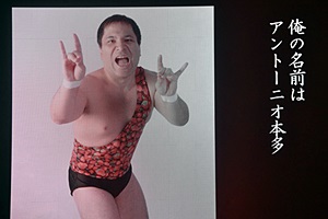 アントンマイク「ニラさんとはもう年に数回しか会わないし、非常に酒癖が悪くてですね、命が危ぶまれるほどの酒癖の悪さのエピソードが噂に聞こえてきます。しかし、DJニラ!俺は前から思っていたんだけど、君は世界一いいレスラーの一人だと思う!今日はどうもありがとう。・・・渡辺哲は生物学的に本多宗一郎の父親です。そしてもう一人、私には父親がおりまして。アントーニオ本多の父親をご紹介します。マッスル坂井です!14年前にあなたと出会って、まさか武蔵野美術大学の中央広場で挨拶し合って、14年後ここ両国国技館で、また一緒にふざけたことをできている。俺はそんな人生が大好きで、本当にみんな最高だ!ありがとう!」(左写真)
