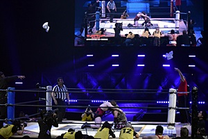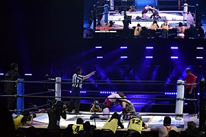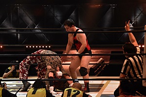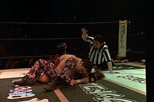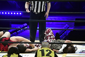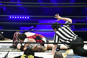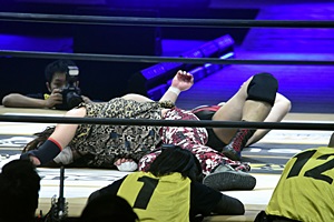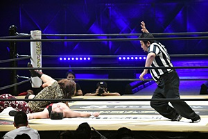 松井レフェリーが試合をストップ。