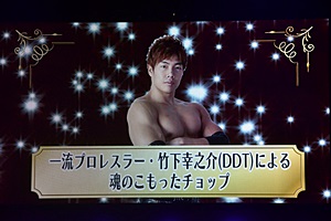 一流プロレスラー竹下幸之介による魂のこもったチョップ音と(左写真)、