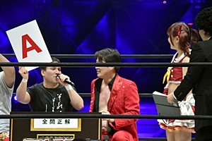 3問終了して全問正解が2チームのため、代表は決定せず。しかし問題は3問しか用意していなかったという亜門。(左写真)