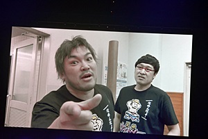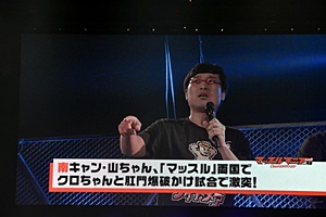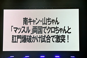 スクリーンに「南キャン・山ちゃん『マッスル』両国でクロちゃんと肛門爆破かけ試合で激突!」の見出し(左写真)。