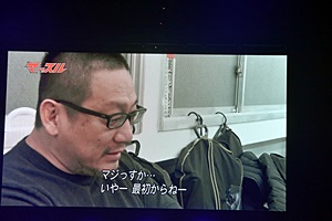 井上マイクリングアナによる控室レポート(左写真)。