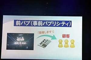 「前パブ」(事前パブリシティ)は観客に対し事前に「開催します!」と伝える宣伝行為(左写真)。