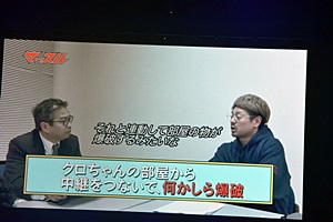 藤井「3つめは、クロちゃんの部屋と中継をつないで、何か部屋の中のものを爆破した方がいいかなと。クロちゃんが技を食らったらそれと連動して部屋のものが爆破するみたいな。」(右写真)