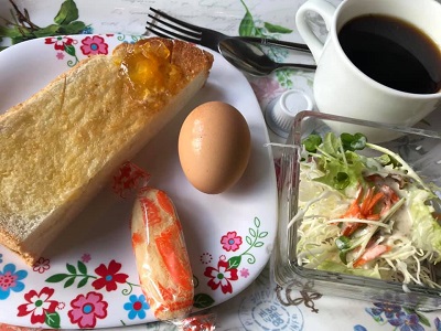 風呂上がりに喫茶店「デル・フィオーレ」でモーニング。ドリンクに無料でモーニングセットが付く名古屋流。これでホットコーヒー代の400円のみ。