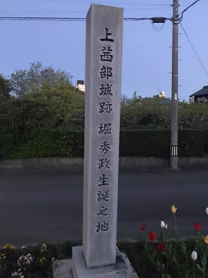 家から西に歩く道はまっすぐではなく、途中で曲がって新荒田川沿いに北上し、橋を渡らなければならなかった。橋からそのまま西進して国道に出るとそこに上茜部城の碑。事前に調べていた道で間違いないことの確認ができた。