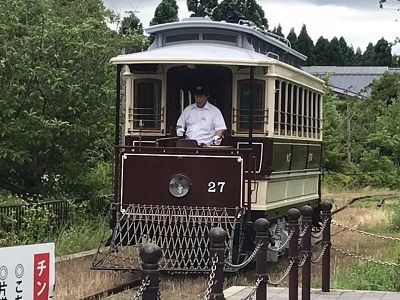 梅小路公園内を走るチンチン電車。つっても架線が張ってないからバッテリー内蔵?250mしか走ってないからそれも可能か?トヨタがサポートしてる旨の看板あったしな。