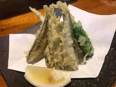メニューに「注文あってから作るので先に一品料理を」と書いてあったので、もりそばと別に小鮎の天ぷらを注文。天ぷらが先に来た。苦みがうまい。
