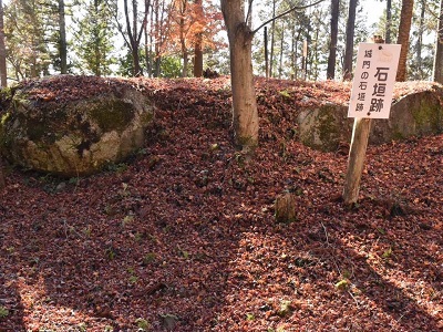 案内図に従ってゆるい坂を上ると明知城。石垣はこれだけ。しかし曲輪が良く残っている。
