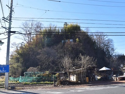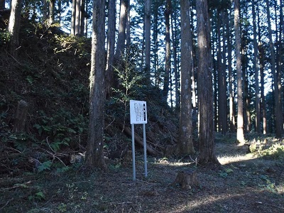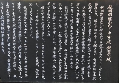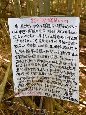 GoogleMapではまだ数百mある感じだったが、目の前に小山。「飯羽間城址」って看板もある。